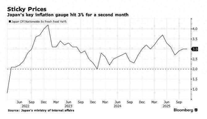 日本总务省周五发布的数据显示,剔除生鲜食品的核心消费者价格指数(CPI)11月同比上涨3%,涨幅与前月持平,且与经济学家的预估中值一致。